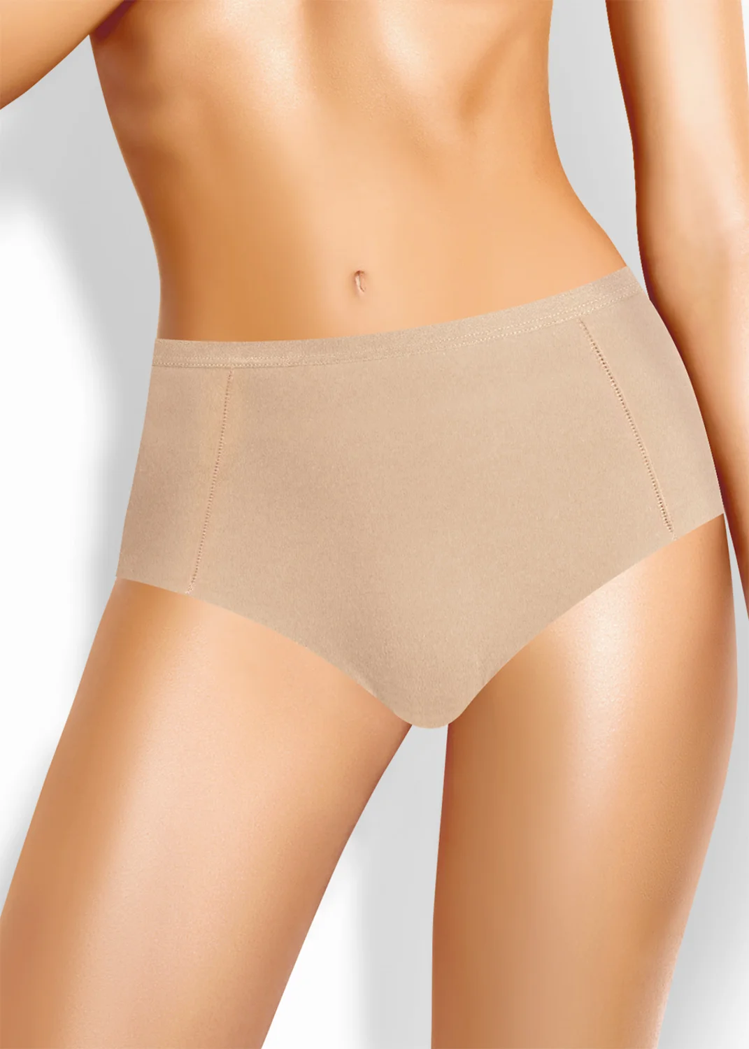 Трусы макси на высокой посадке из интерлока, состав 80% хлопок, 20% эластан. Боковые швы смещены в сторону переда, по ножке бесшовная обработка, полотно не распускается за счет особенностей плетения, по талии обработка жаккардовой резинкой. св.бежевый