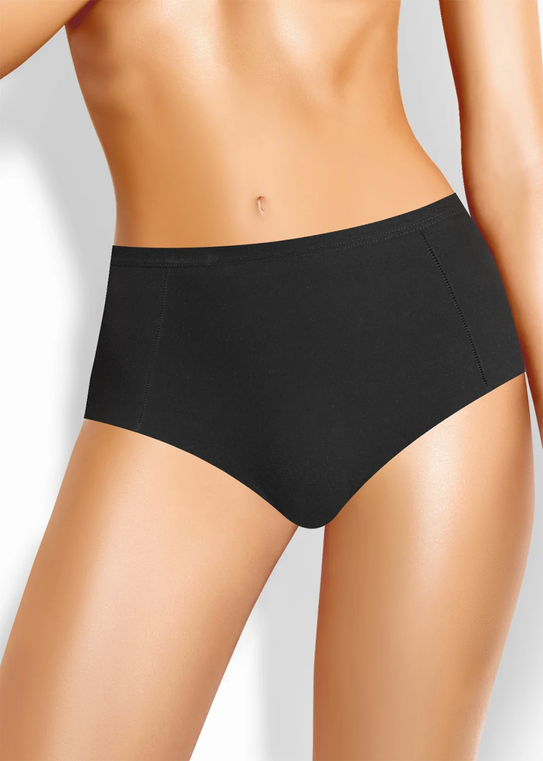 Трусы макси на высокой посадке из интерлока, состав 80% хлопок, 20% эластан. Боковые швы смещены в сторону переда, по ножке бесшовная обработка, полотно не распускается за счет особенностей плетения, по талии обработка жаккардовой резинкой. чёрный