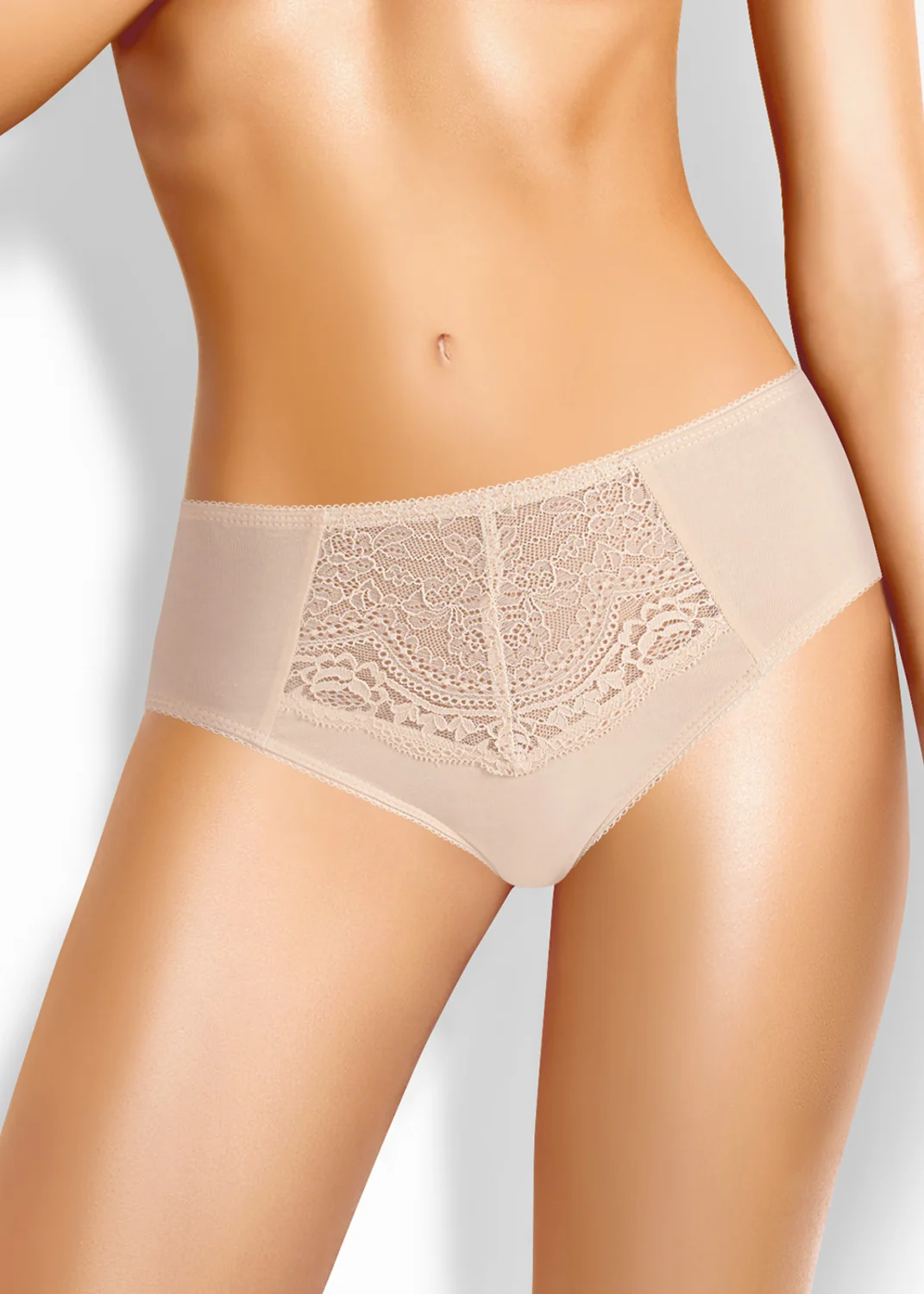 Трусы-слипы женские из эластичного хлопкового полотна. По переду резы и вставки из кружева. Обработка краев - ажурная резинка с фестоном. св.бежевый