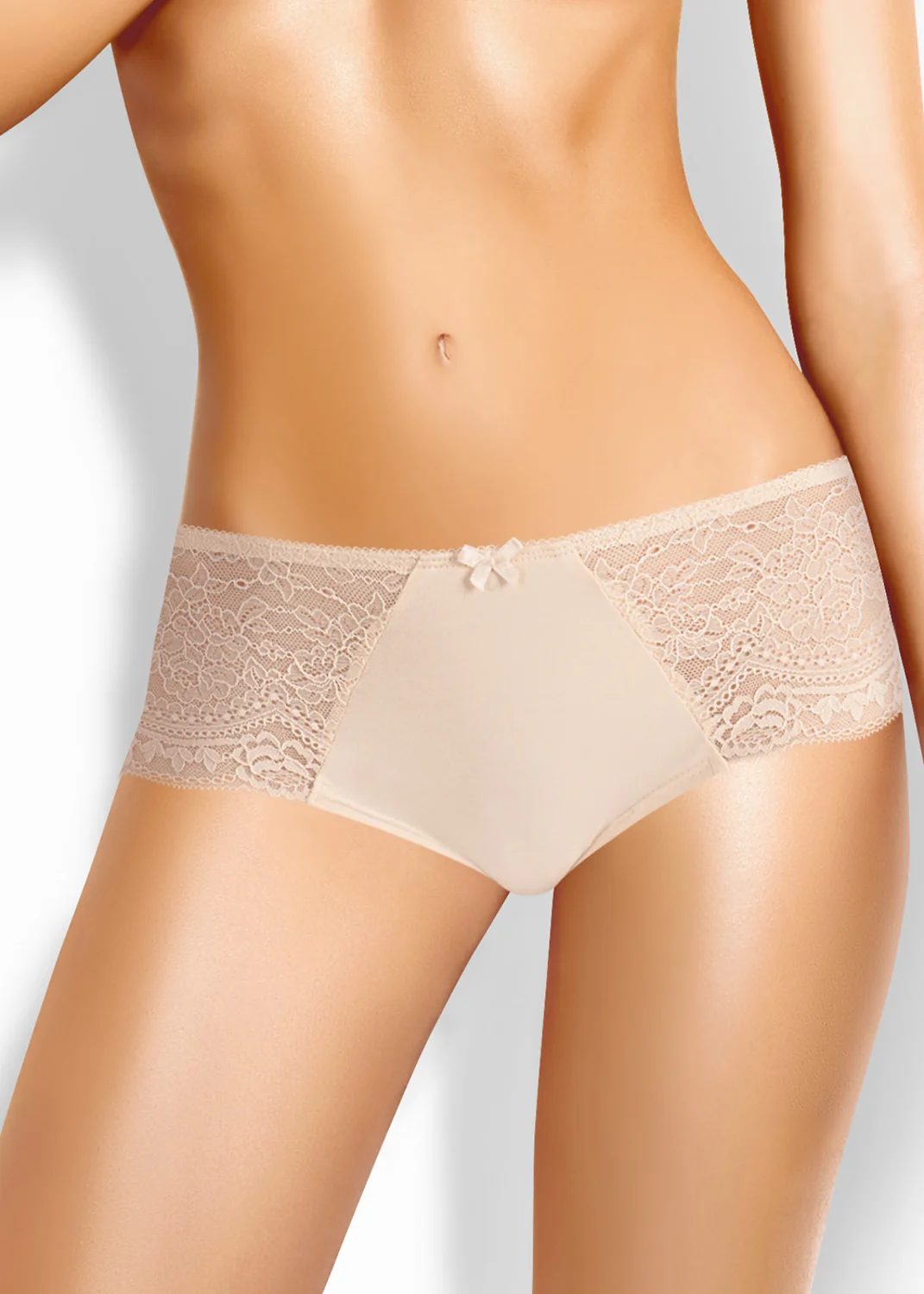 Трусы-шорты женские из эластичного хлопкового полотна. По спинке и бокам кружево. Обработка краев по талии - ажурная резинка с фестоном. Спереди бант. св.бежевый