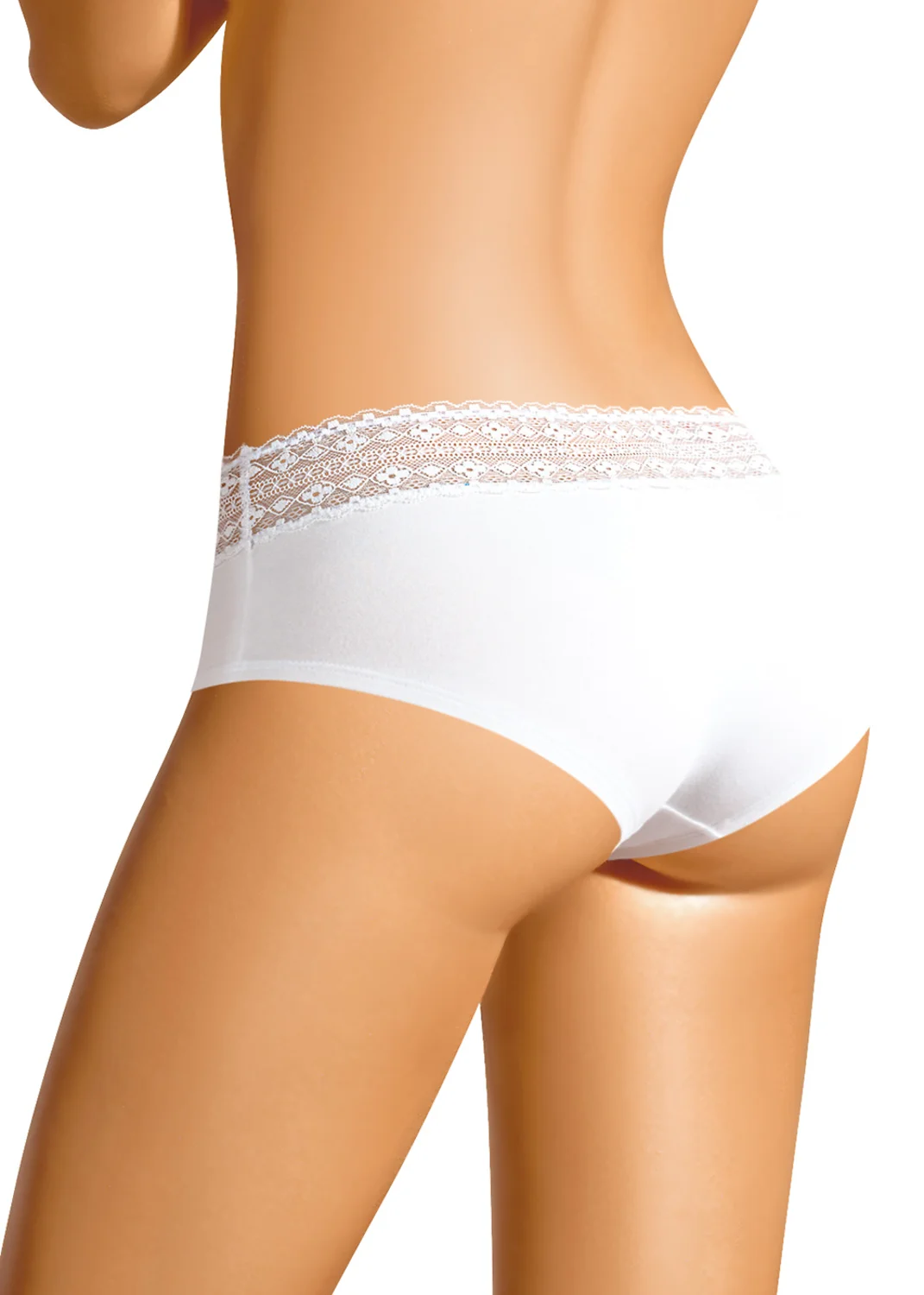 Трусы-шорты женские из эластичного хлопкового полотна. Обработка краев по талии - кружево, по ноге - подгибка. белый