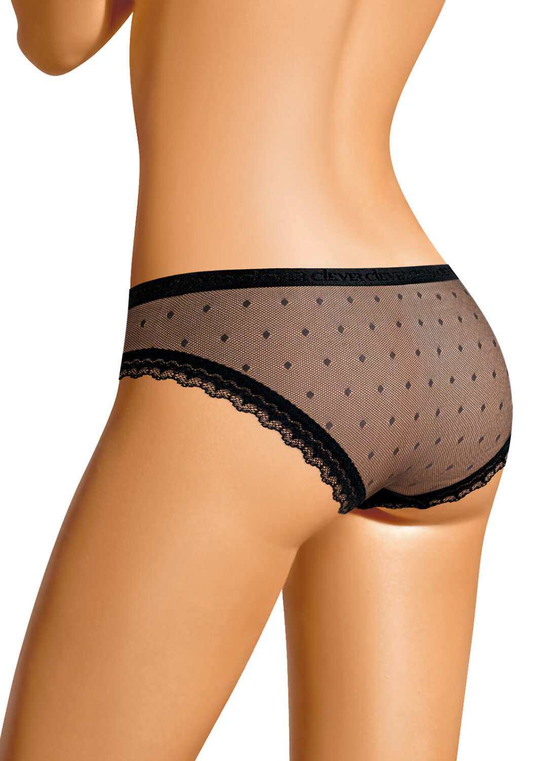 Трусы-бикини женские из эластичного хлопкового полотна. Обработка краев по талии - фиременной жаккардовой резинкой, по ноге - узким кружевом. Спинка из сетки. По переду декоративные вырезы с узкими перекрестными резинками. чёрный