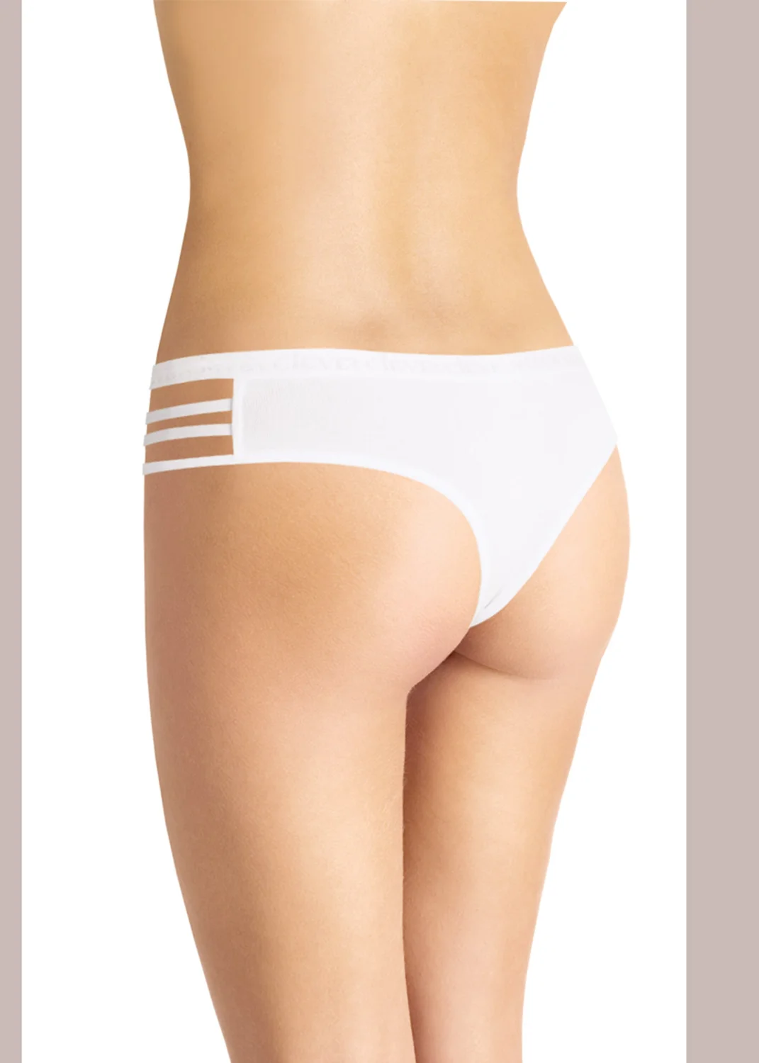 Трусы-бразилиано женские из эластичного хлопкового полотна. Обработка краев по талии - фирменная жаккардовая резинка, по ноге - узкая окантовка. По бокам декоративные вырезы с узкими резинками. белый