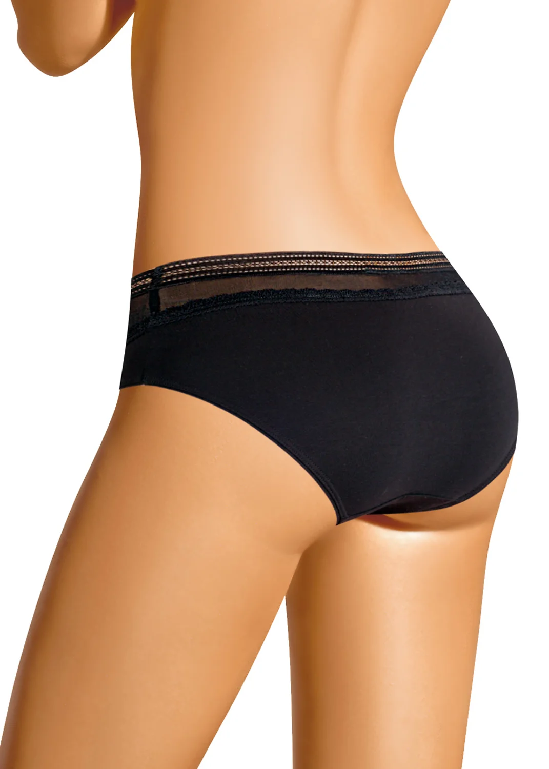 Трусы-бикини женские из эластичного хлопкового полотна. Спереди вставка из сетки с узким кружевом. Обработка краев по талии - сеткой с ажурной широкой резинкой, по ноге - узкой окантовкой. чёрный