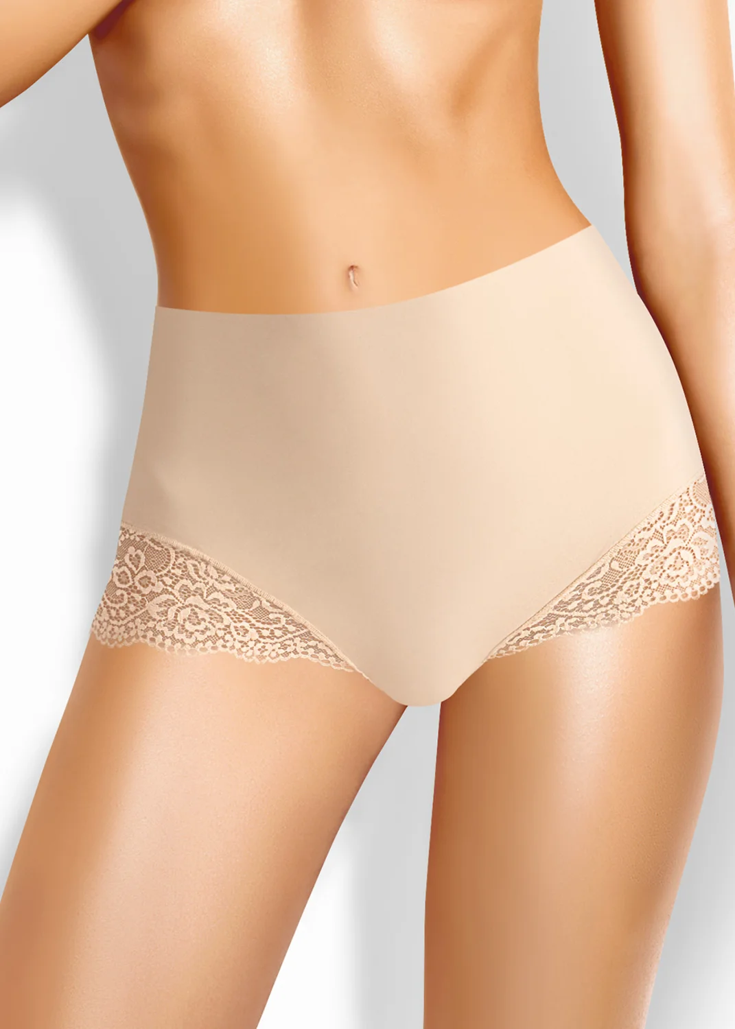 Бесшовные трусы макси комфортной посадки. По ножке настрочено широкое кружево. св.бежевый