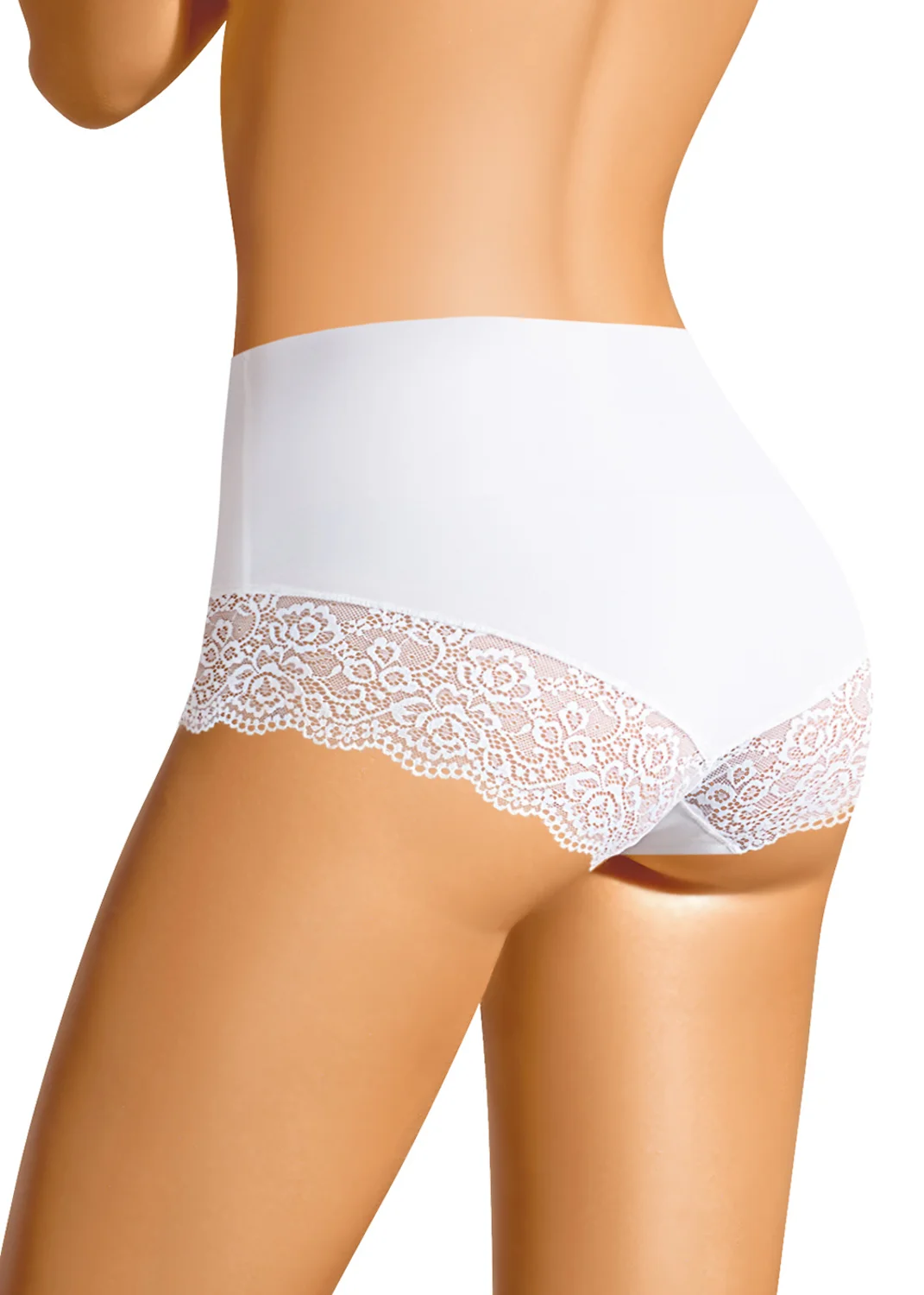Бесшовные трусы макси комфортной посадки. По ножке настрочено широкое кружево. белый