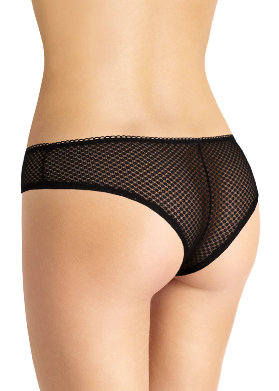 Бразилиано. Комбинированная модель: перед - однотонное хлопковое полотно, спинка и отрезной бочок - кружево. По талии - резинка с фестоном. В центре на детали переда расположен небольшой атласный бант. Декорированы симметричными элементами из кружевной тесьмы,расположенными по линии реза чёрный