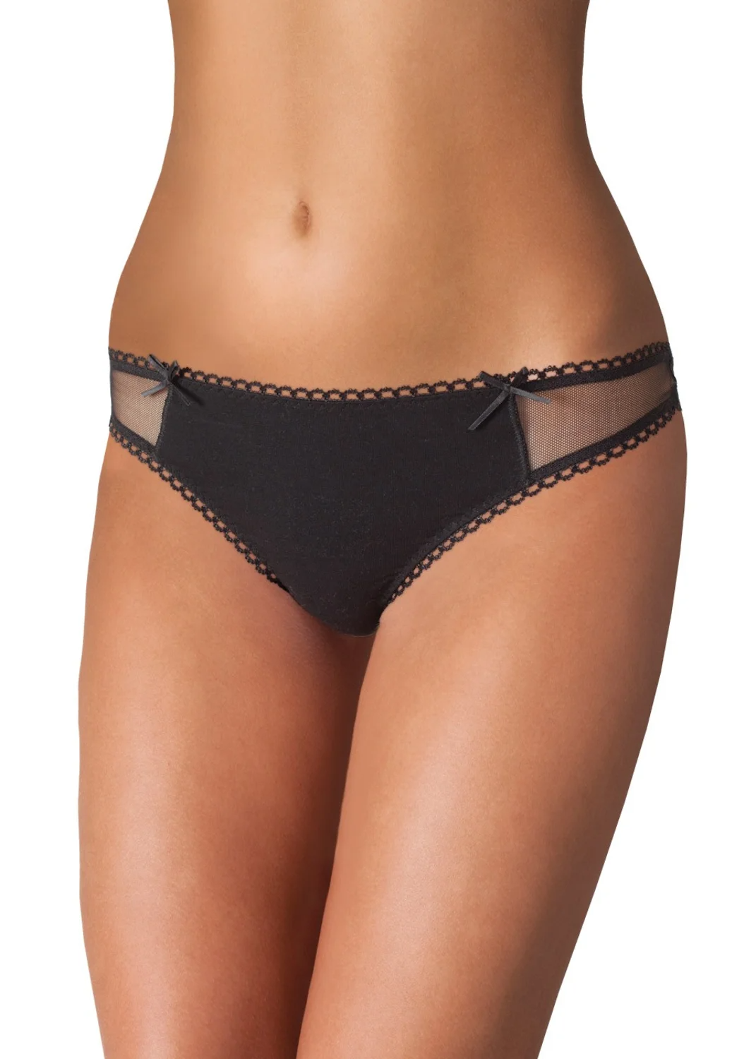 Стринги, комбинированная модель: деталь переда -кулирная гладь, спинка - сетка. По поясу и ноге обработка резинкой с фестоном. Спереди по центру атласный бант. чёрный