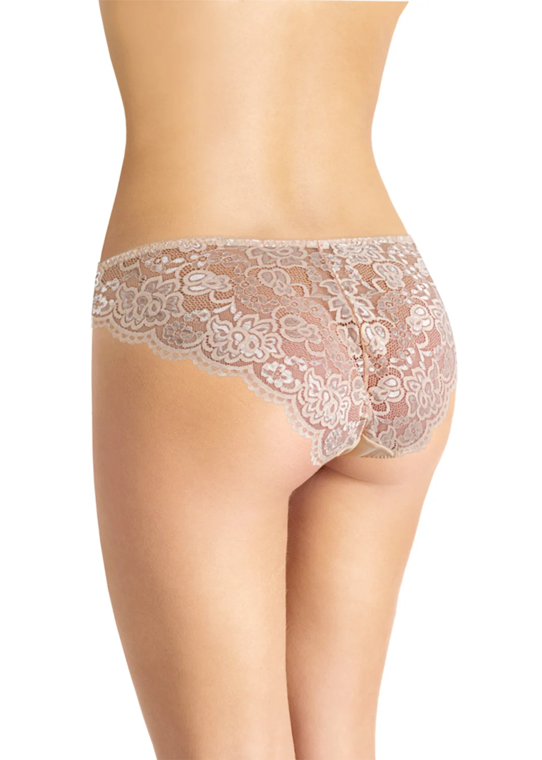 Бикини с кружевной вставкой по верху переда и кружевной спинкой со средним швом. По поясу и ножке со стороны переда обработка резинкой с фестоном. На детали переда - небольшой атласный бант. св.бежевый