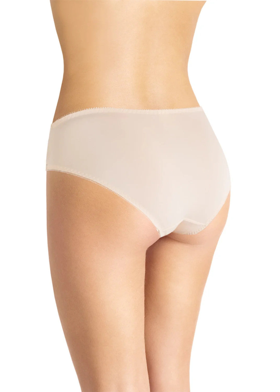 Классическая модель из однотонного трикотажа. Деталь переда симметрично декорирована кружевом По ножкам спереди и по талии - резинка с фестоном. На детали переда по центру - небольшой атласный бант. св.бежевый