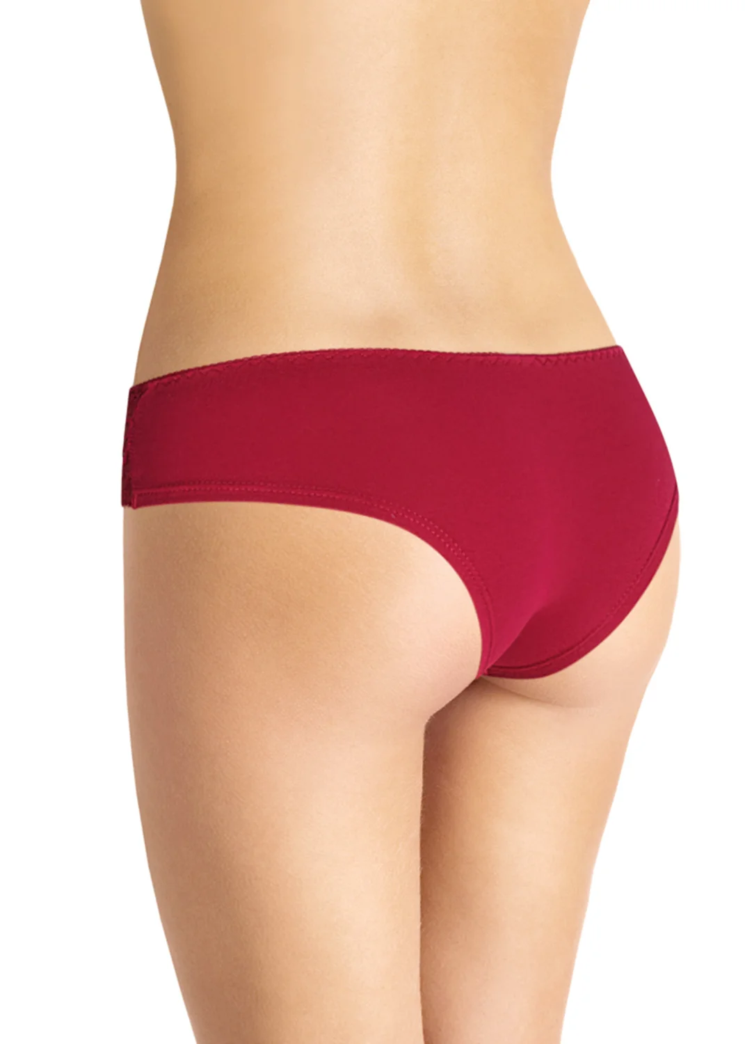 Трусы бразилиано женские из эластичного хлопкового полотна. По переду кружево и бант. Обработка краев - ажурная резинка с фестоном бордовый