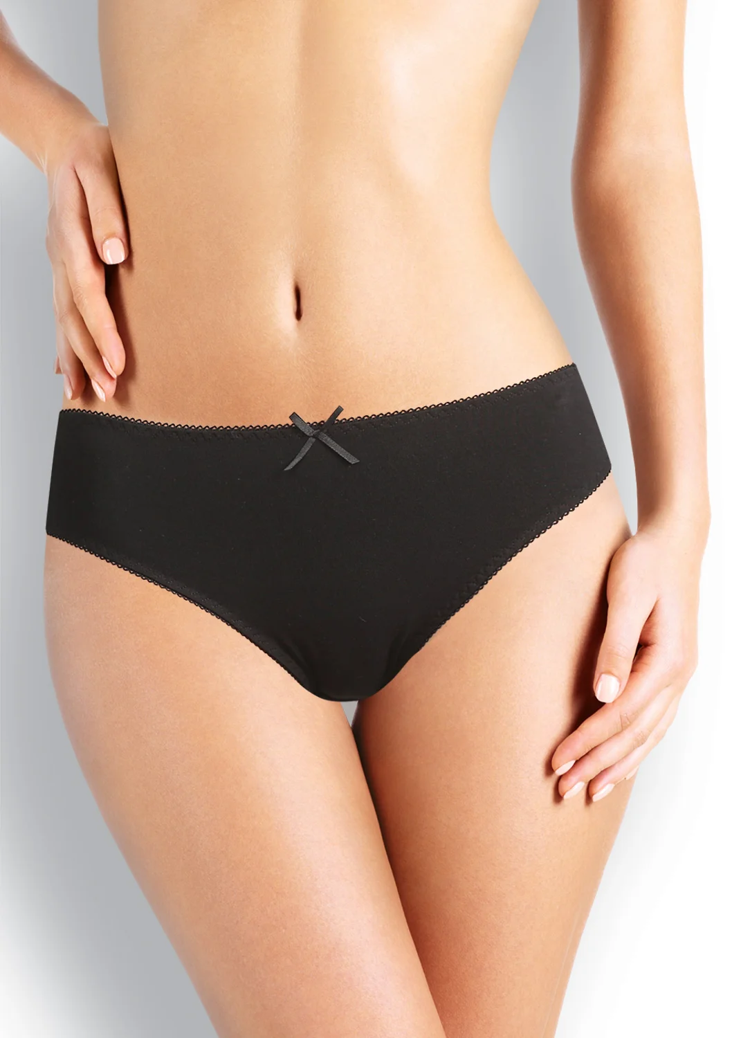 Трусы-слипы женские из эластичного хлопкового полотна. Обработка краев - ажурная резинка с фестоном. По переду атласный бант. чёрный