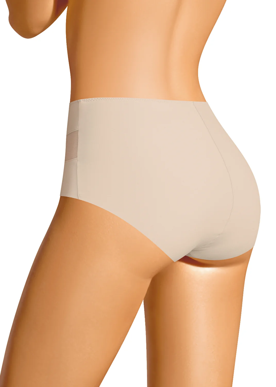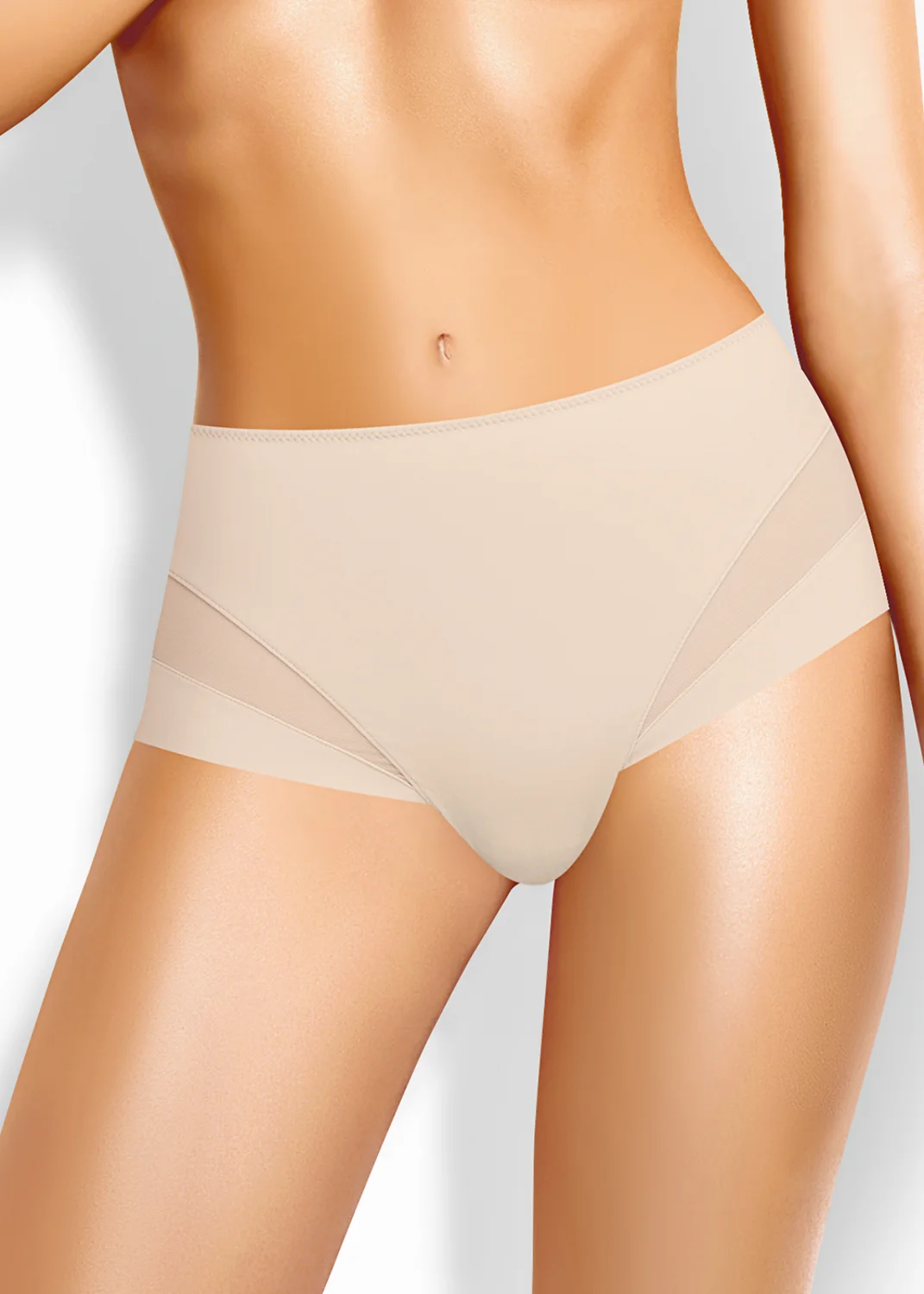 Трусы слипы с завышенной посадкой, сзади и по линии бикини бесшовная гладкая обработка, спереди декоративные диагональные вставки из плотной сетки, перед дублирован сеткой, по талии обработка с зигзагом и узкой резинкой св.бежевый