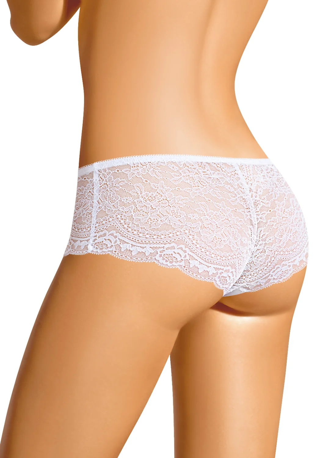 Трусы-шорты женские из эластичного хлопкового полотна. Спинка и вставки по переду из кружева. Обработка краев по талии - ажурной резинкой с фестоном. Спереди бант. белый