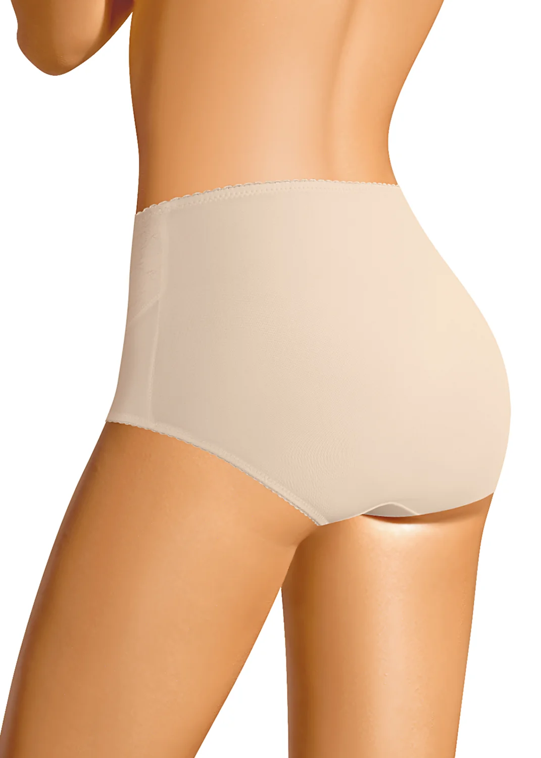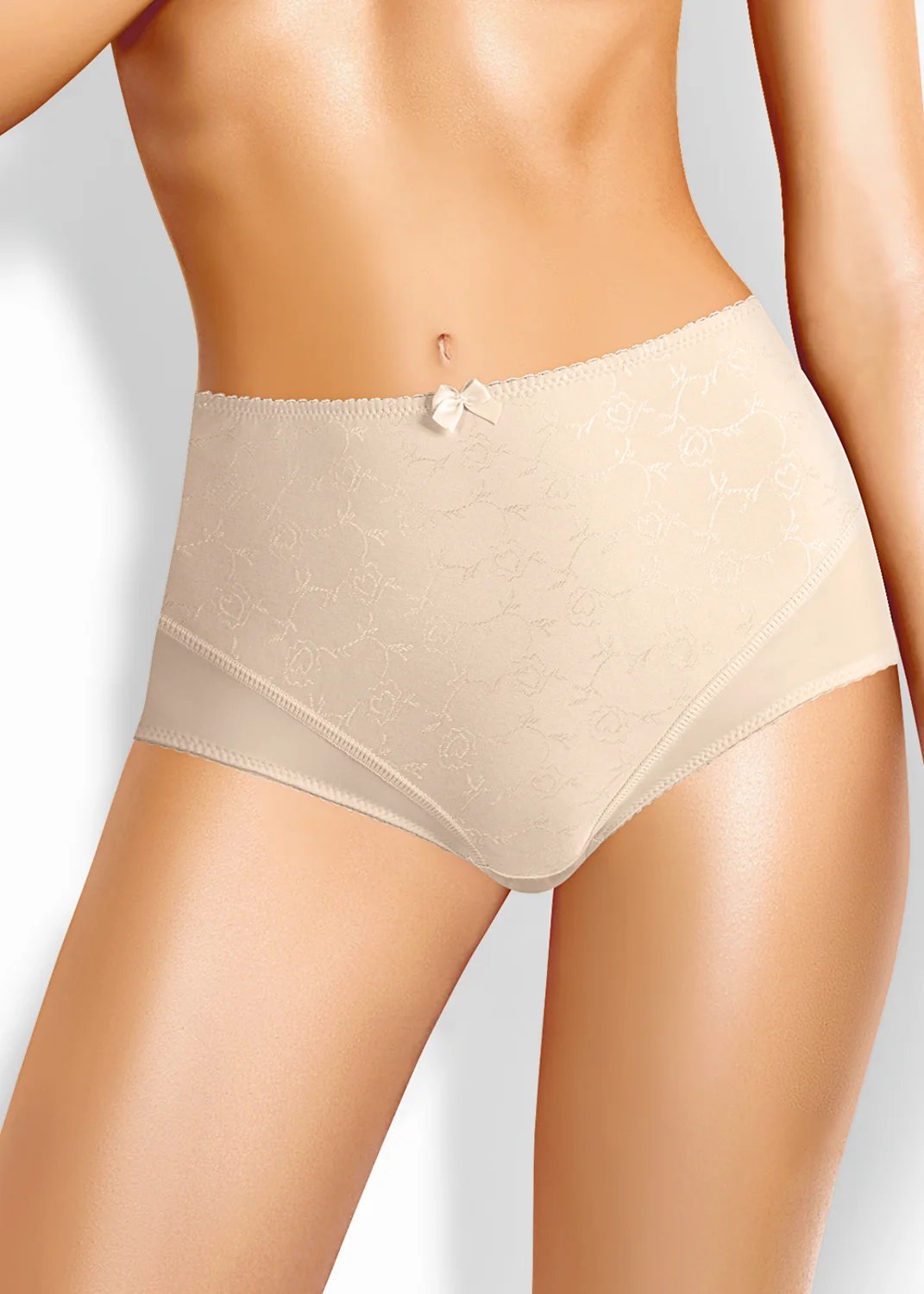 Трусы-макси утяжка женские из полиамида. Обработка краев - ажурная резинка с фестоном. Перед дублируется вставкой из эластичного жаккардового полотна. По переду бант. Производство Китай. св.бежевый