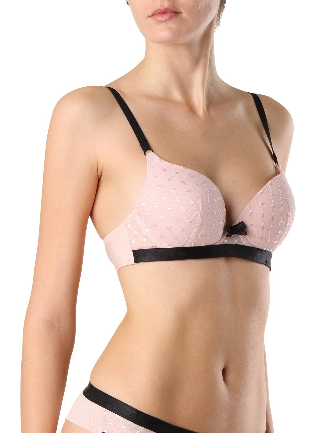 Push-up. Формованная чашка. На каркасах. Австрийская вышивка на эластичной сетке. Широкие контрастные тесьмы в стиле спорт-шик. Декор в виде бантиков с кружевным элементом. Регулируемые бретели. Дополнительный объем для соблазнительного образа. Чувственное белье, выполненное в лучших традициях французского стиля.