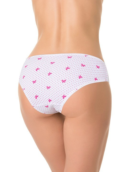 Трусы со средней линией талии, выполнены из мягкого хлопка со спандексом. Полотно с принтом "бантики и горошки". Ножки и талия обработаны контрастной эластичной тесьмой с деликатным блеском. 1 шт. в упаковке. Упаковка - картонная коробочка.