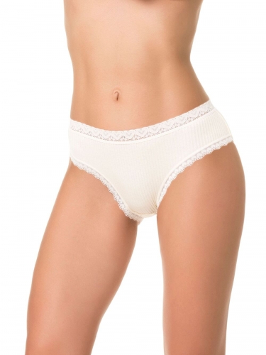 95% хлопок, 5% спандексТрусы со средней линией талии, выполнены из деликатного хлопкового полотна "лапша" с добавлением эластана. Обработка по талии и ножке - узкое кружево. Упаковка - картонная коробочка.
