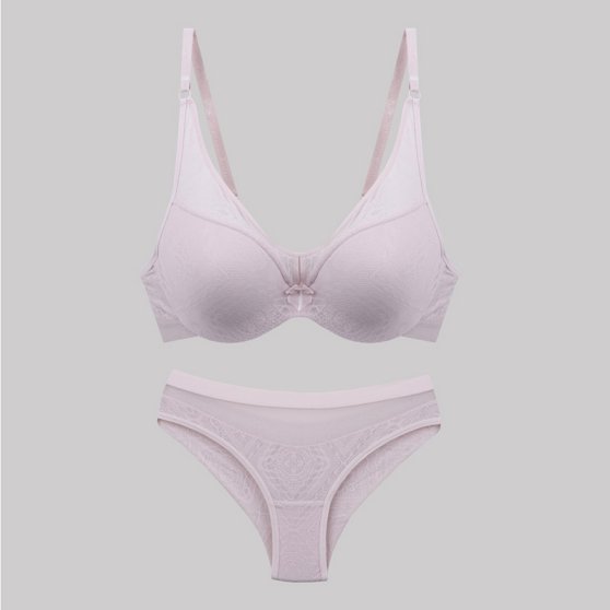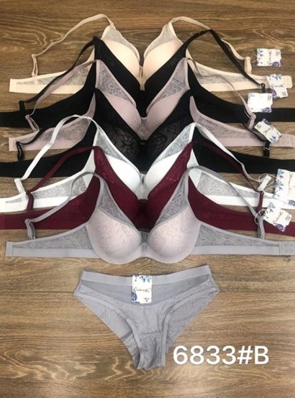 Оптовая продажа. Бюстгальтер с формованной чашкой, небольшой "Пуш-ап" выполнен из мягкой микрофибры и кружевной микросетки, низ оформлен широкой эластичной резинкой, бретели литые, сзади отстегиваются. Трусики-бразильяна из микросетки с кружевным рисунком, широкая эластичная резинка по поясу.