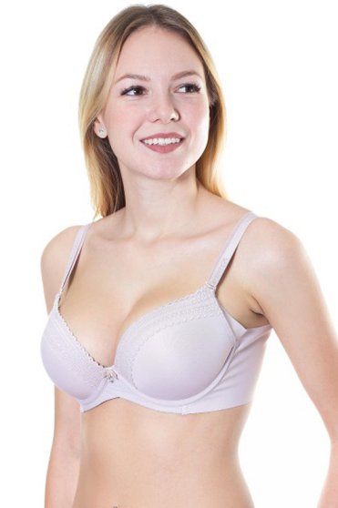 Оптовая продажа. Бюстгальтер с формованными чашками и фигурным "пуш-ап", выполненный из гладкой микрофибры, стан по бокам с бесшовным обрезным краем, на чашках ажурные вставки по верхнему краю, декоративная подвеска в центре, съёмные регулируемые бретели.