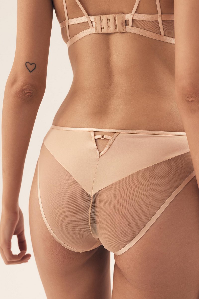 Слипы Nuts в золотисто-коричневом оттенке. Они мягко обвивают тело, подчеркивая изгибы и создавая гладкую линию бедер. Их сверхлегкая структура обеспечивает мягкость на ощупь и воздухопроницаемость, благодаря чему модель отлично подходит для повседневной носки. Материал передней части слипов выполнен из ультралегкой нежной микрофибры, тем временем как задняя часть дополнена прозрачным близким к телу микротюлем и золотым колечком. Хлопковая ластовица.