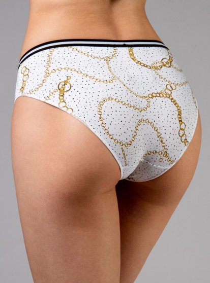 Оптовая продажа. Трусики слипы женские из бамбуко-хлопкового полотна с добавлением эластана, повышающий прочность и качество одежды, создавая идеальное облегание фигуры. Имеют среднюю посадку, мягкую и эластичную тонкую резинку по талии в полоску, удерживающие трусы во время носки. Модель выполнена в белом цвете с рисунком в виде золотых цепей и мелких точек по всему полотну, без декоративных элементов. Отлично пропускают воздух и быстро впитывают влагу, сохраняя ощущение свежести на протяжении всего дня. Гигиеничная хлопковая ластовица.