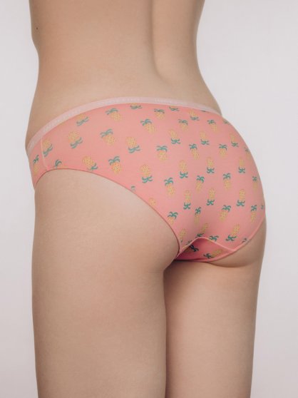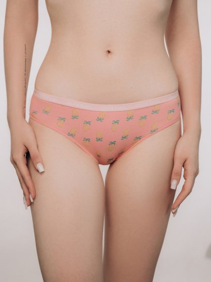 Оптовая продажа. Трусики слипы женские розового цвета, с рисунком ананасы по всему полотну изделия, из натурального хлопка с добавлением эластана, повышающий прочность и качество одежды, создавая идеальное облегание фигуры. Имеют среднюю посадку, мягкую и эластичную резинку по талии с фирменным логотипом, удерживающая трусы во время носки, не сдавливая и не оставляя следов на коже. Гигиеничная хлопковая ластовица позволяет избежать трения и раздражения кожи. Тактильно приятные на ощупь подходят даже для самой чувствительной кожи. Комфортная повседневная модель.