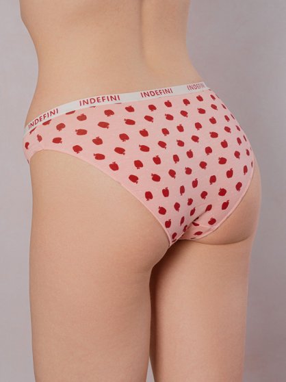 Оптовая продажа. Трусики слипы женские из натурального хлопка с добавлением эластана, повышающий прочность и качество одежды, создавая идеальное облегание фигуры. Имеют среднюю посадку, мягкую и эластичную резинку по талии с фирменным логотипом, удерживающие трусы во время носки. Модель выполнена в розовом цвете с рисунком в виде “яблок” по всему полотну изделия. Гигиеничная хлопковая ластовица позволяет избежать трения и раздражения кожи. Удобная и комфортная модель для повседневного белья. Рекомендуется бережная стирка при 30С.