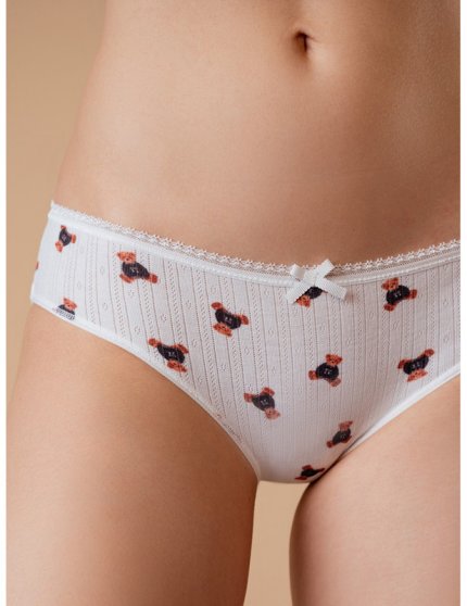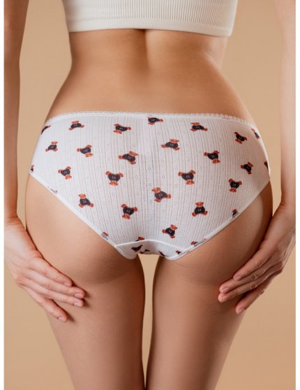 Оптовая продажа. Трусики слипы женские из высококачественного трикотажного полотна, с рисунком в виде плюшевых мишек. Ткань выполнена с отверстиями. Имеют среднюю посадку, мягкую и эластичную тонкую резинку по талии, украшенную кружевом, удерживающие трусы во время носки. Модель выполнена в белом цвете. Гигиеничная хлопковая ластовица позволяет избежать трения и раздражения кожи. Удобная и комфортная модель для повседневного белья. Рекомендуется бережная стирка при 30С.