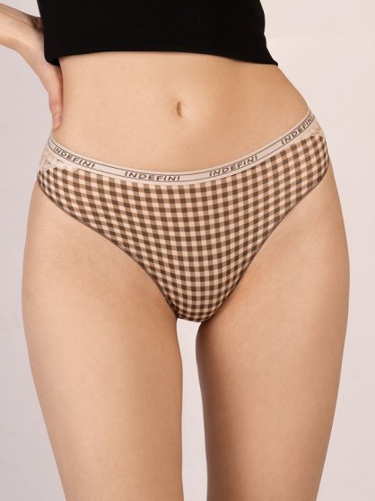 Оптовая продажа. Трусики слипы женские из бамбуко-хлопкового полотна с добавлением эластана, повышающий прочность и качество одежды, создавая идеальное облегание фигуры. Имеют среднюю посадку, мягкую и эластичную тонкую резинку по талии, удерживающую трусы во время носки. Оригинальный принт в бежево-коричневую клетку придаёт женским труса стильный и современный вид. Кружевные вставки по бокам и на задней части добавляют романтичности и женственности, делая эти трусы привлекательными. Гигиеничная хлопковая ластовица позволяет избежать трения и раздражения кожи.