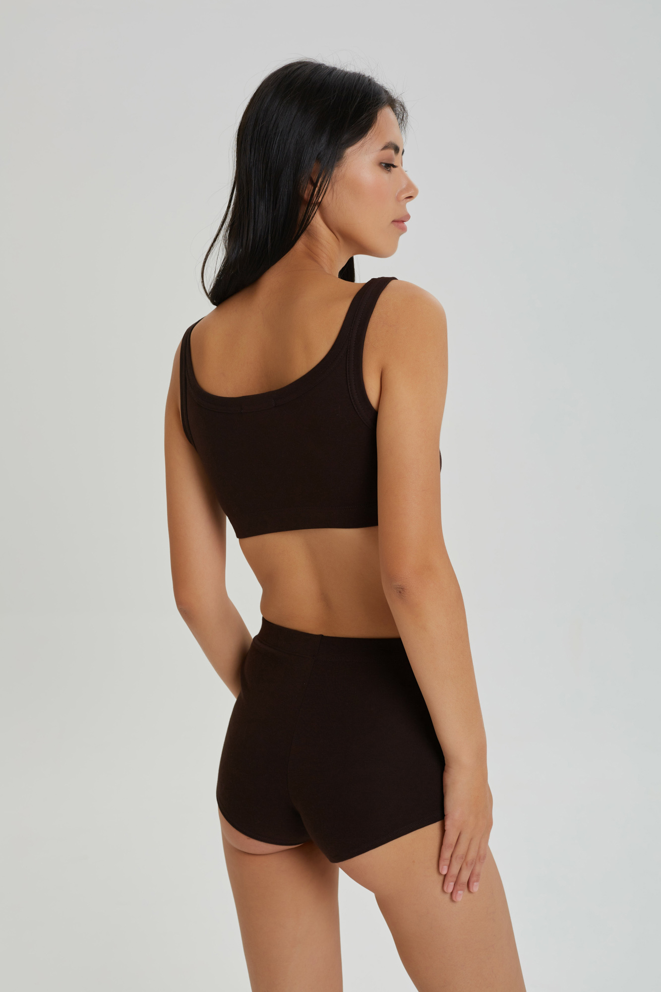 Состоит из бралета на широких бретелях, по низу мягкая резина и трусики-шортики.