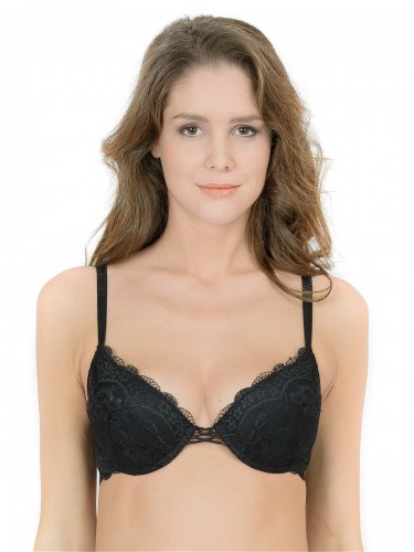 Бюстгальтер с формованной чашкой пуш-ап. Выполнен из эластичного мягкого кружева с цветочным узором плетения. Кружево выглядит объемным и фактурным за счет сочетания двух видов нитей: матовой и глянцевой. В качестве декоративного элемента служит плетенный шеврон между чашек в виде кокетливой шнуровки ручной работы. Бретель несъемная. Застежка в один ряд на 3 позиции. полиамид 80%,эластан 15%,полиэстер 5%