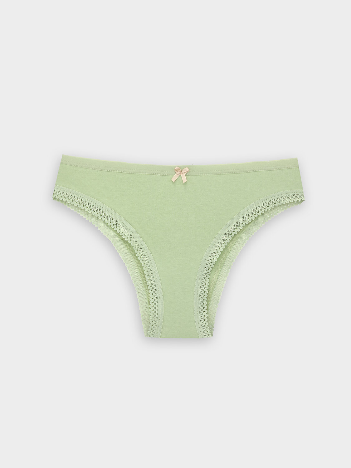 Слип-бикини из высококачественного хлопка и нежного кружева. Посадка по талии классическая средняя. Нижние срезы трусиков декорированы кружевной тесьмой. Трусы женские хлопковые слипы — это популярная модель женского белья. Невероятно удобные, благодаря своей заниженной посадке, они пользуются заслуженной любовью покупательниц. Продуманная анатомическая конструкция, плоские швы и деликатные резиночки делают эту модель подходящей для занятий спортом. Широкий размерный и цветовой ряд. Рекомендуем! лавровый зеленый