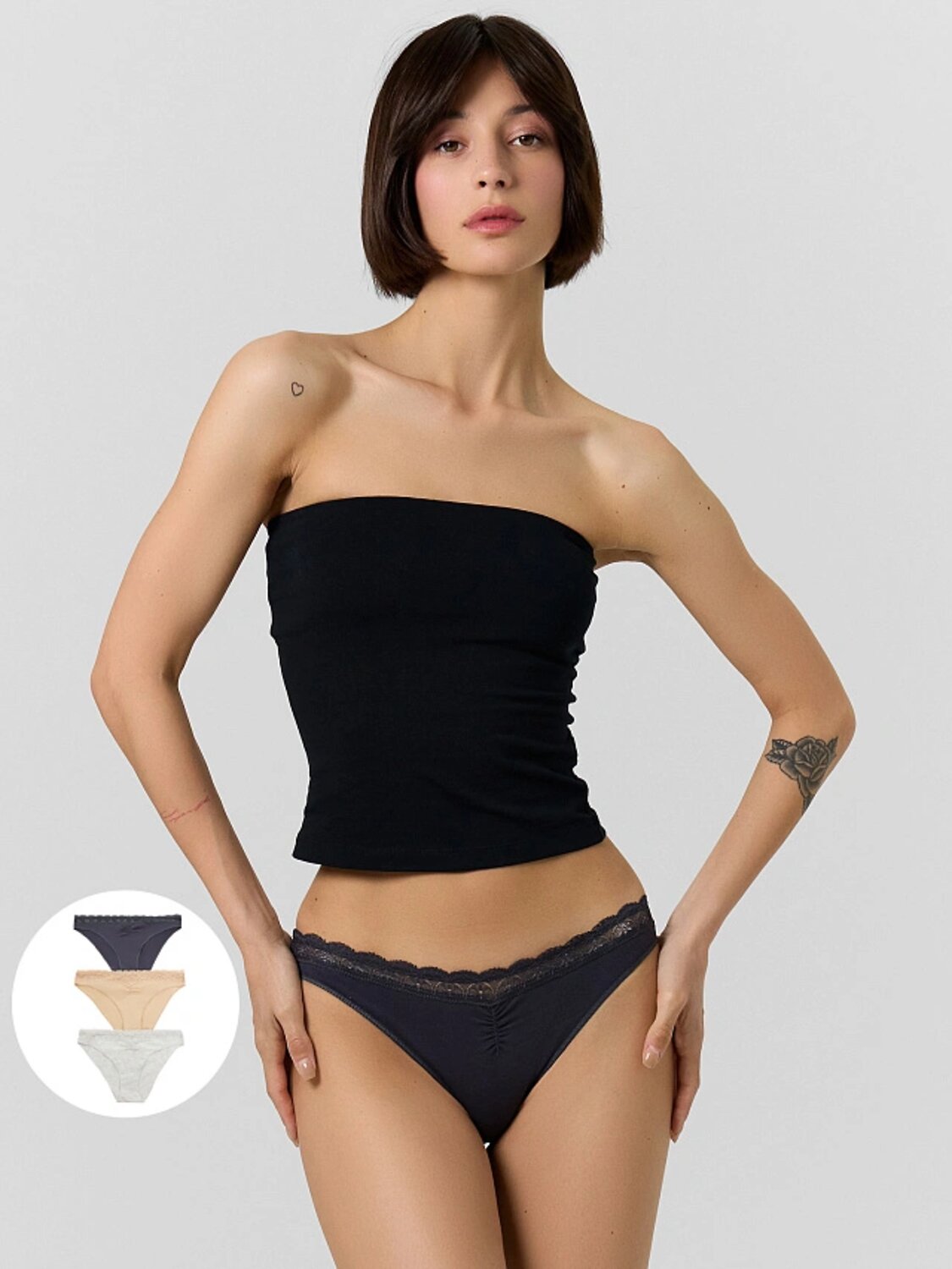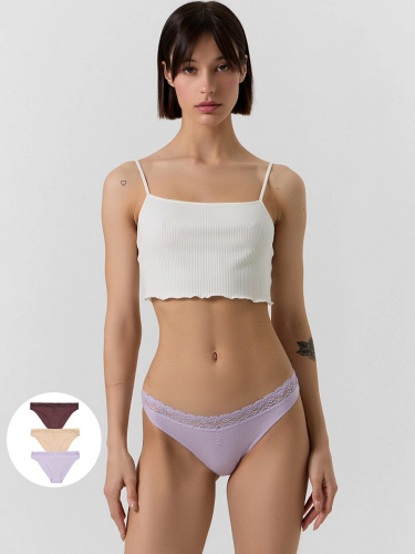 Набор женских трусиков-бикини в разных цветах из высококачественного хлопка с кружевными деталями. Заниженная линия талии позволяет носить одежду с посадкой на бедрах, а довольно глубокие вырезы по бокам визуально делают ноги длиннее и подчеркивают стройность и грациозность фигуры. Изюминка модели - кружевные детали, которые придают образу особый шарм и очарование. Продуманная анатомичная конструкция, плоские швы и деликатные резиночки делают эту модель подходящей для занятий спортом, можно использовать её как спортивное бельё, а также как ночные трусики для сна. Благодаря широкому размерному и цветовому ряду, в линейке Mark Formelle вы обязательно найдете модель белья с удобной посадкой по своему вкусу! В наборе: 3 шт.