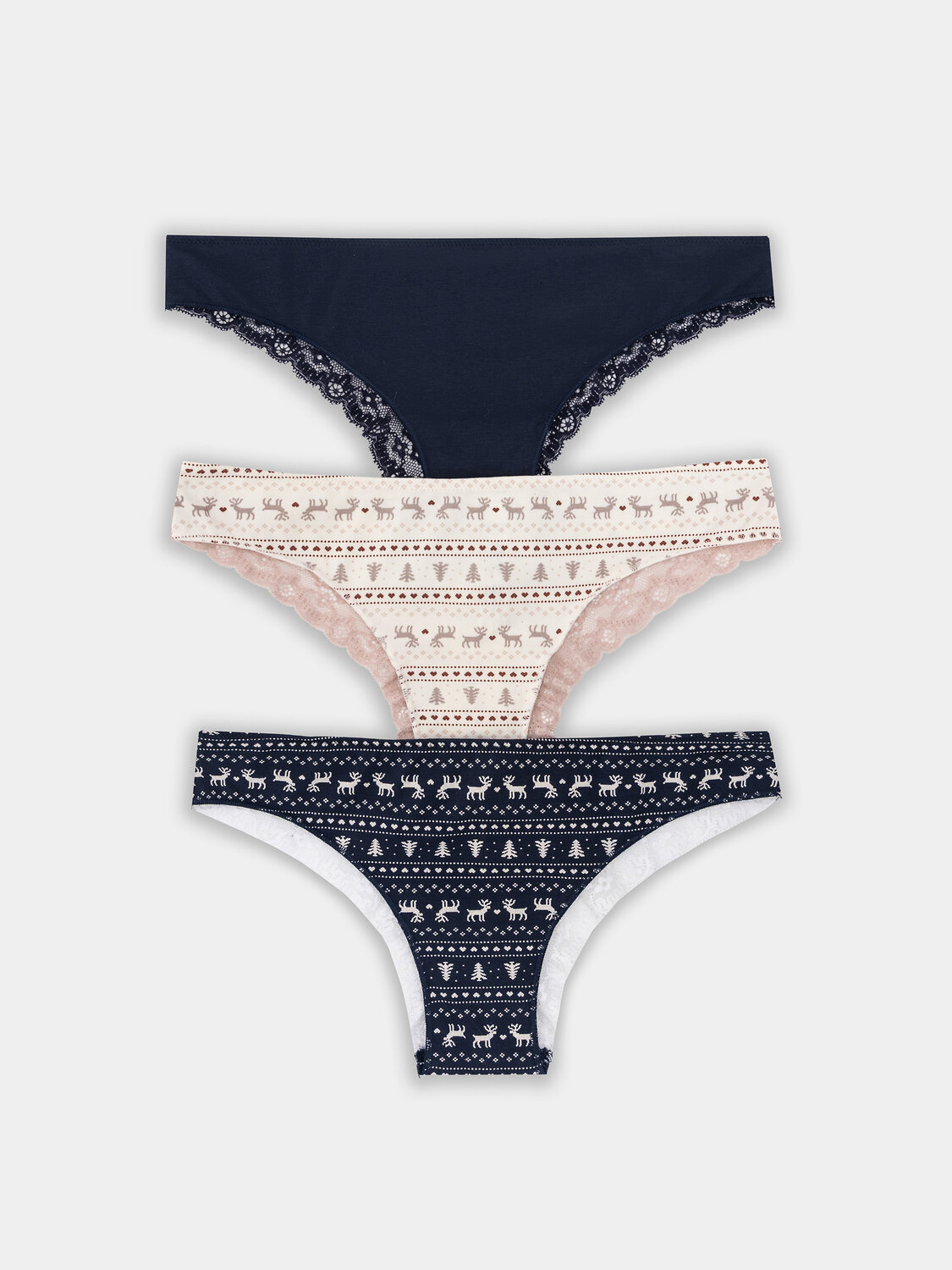 Стильный набор женских трусиков бразилиана (3 шт.) разных цветов из высококачественного хлопка с кружевными деталями. Невероятно удобные, благодаря своей невысокой посадке, они пользуются заслуженной любовью покупательниц. Изготовлены из натурального материала, дышащего, мягкого, гипоаллергенного - идеального для повседневной носки. Продуманная анатомичная конструкция, плоские швы и деликатные резиночки делают эту модель подходящей для занятий спортом, можно использовать её как спортивное бельё, а также, оно идеально для ежедневной носки. Пригодятся трусы бразилиана и будущим мамам: талия трусиков удобно помещается под растущим животиком и абсолютно не давит. Отлично тянутся, хорошо пропускают воздух и не создают парникового эффекта. Размерный ряд широкий, красивые базовые цвета и модели с принтами - никого не оставят равнодушными. Милый дизайн радует глаз, а дополнить такие трусики легко шикарным верхом из линейки нижнего женского белья. Порадуйте себя и близких красивым женским бельем на праздники и просто без повода!