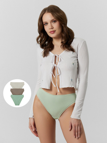 Мультипак из трех пар классических женских трусиков со средней линией талии. Выполнены из трикотажной рибаны – в рубчик. Вырхний срез украшен узким кружевом. Красиво и комфортно!