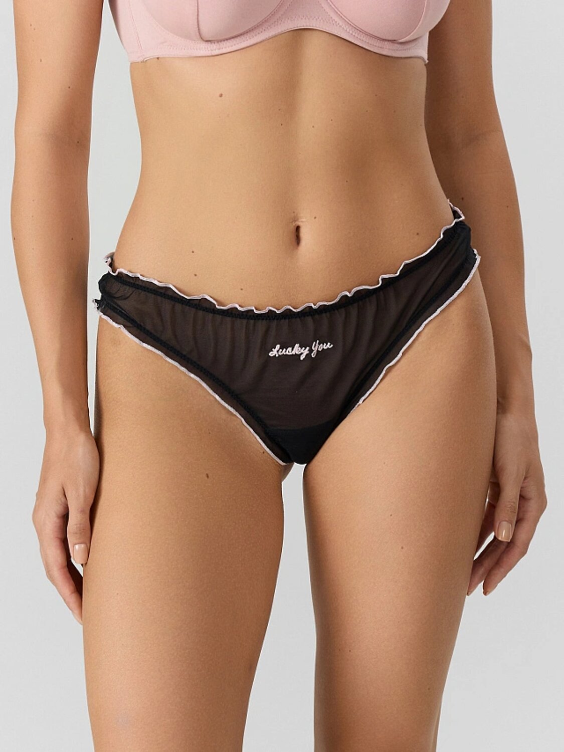 Трусы-бразилиана из сеточки с надписью "Lucky you" — это провокационное сочетание нежности и кокетства. Их средняя линия талии подчеркивает изгибы фигуры, оставаясь при этом удобной и ненавязчивой. Полупрозрачная фактура сетки придает образу легкость и флирт, в то время как надпись становится своеобразным посланием, которое видит лишь тот, кто действительно близко. Подкладка ластовицы выполнена из мягкого хлопка, что обеспечивает комфорт при носке и деликатную заботу о коже. В отделке верхнего среза и линии ножек использованы рюши из сборки, придающие трусам легкую романтичность и визуальную игривость. Они выглядят как утренняя фантазия или каприз настроения: немного дерзкие, немного наивные, но совершенно особенные. Эта модель — выбор той, кто не боится выражать свою индивидуальность, даже в самых мелких деталях. Такой элемент гардероба не просто подчеркивает форму, но становится частью настроения, передает характер и играет роль маленького секретного акцента, который создает целостный образ уверенной, стильной и немного озорной женщины. черный