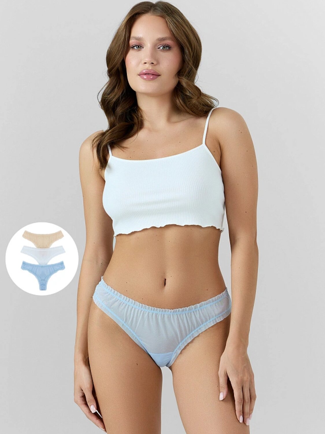 Трусы женские, средняя линия талии, силуэт - бразилиано. Передняя и задние детали выполнены из сетки. Подкладка ластовицы из хлопка, верхний срез подкладки ластовицы отлетной. По верхнему срезу трусов и по ножкам рюша из сборки, под низом жилка.