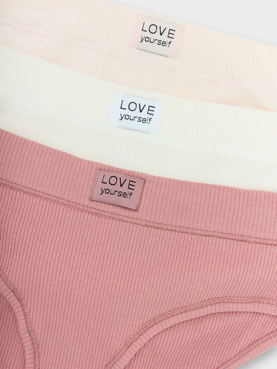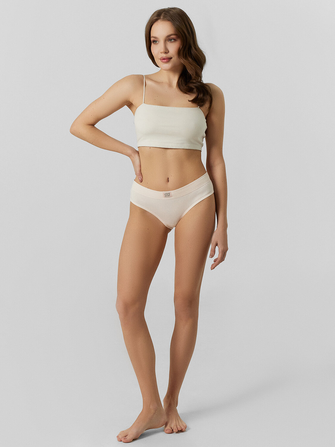 Трусы женские, средняя линия талии, силуэт - слипы. Передняя и задняя детали выполнены из рибаны. Верхний срез трусов обработан бейкой поперечной из рибаны, внутри жилка 6мм. Нижние срезы обработаны бейками поперечными из рибаны. Подкладка ластовицы из хлопка, отлетная по верхнему срезу. пудра