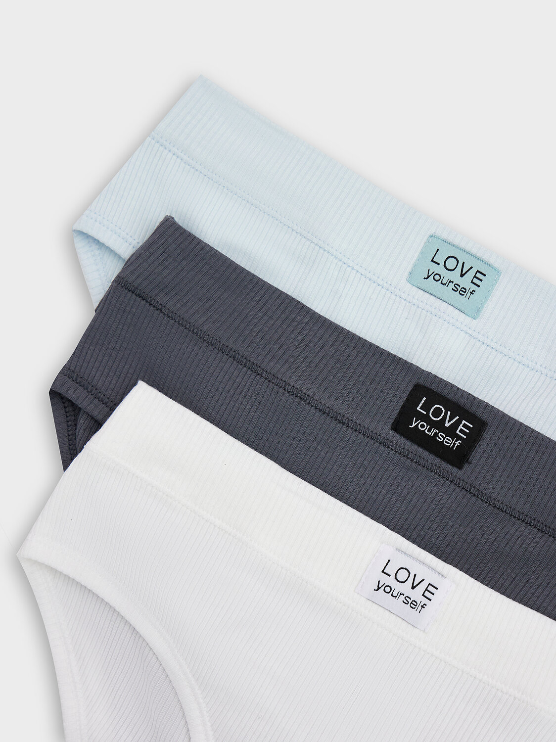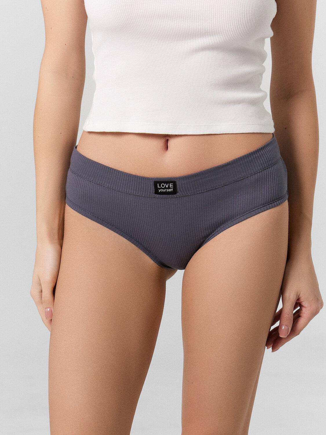 Трусы женские, средняя линия талии, силуэт - слипы. Передняя и задняя детали выполнены из рибаны. Верхний срез трусов обработан бейкой поперечной из рибаны, внутри жилка 6мм. Нижние срезы обработаны бейками поперечными из рибаны. Подкладка ластовицы из хлопка, отлетная по верхнему срезу. графит