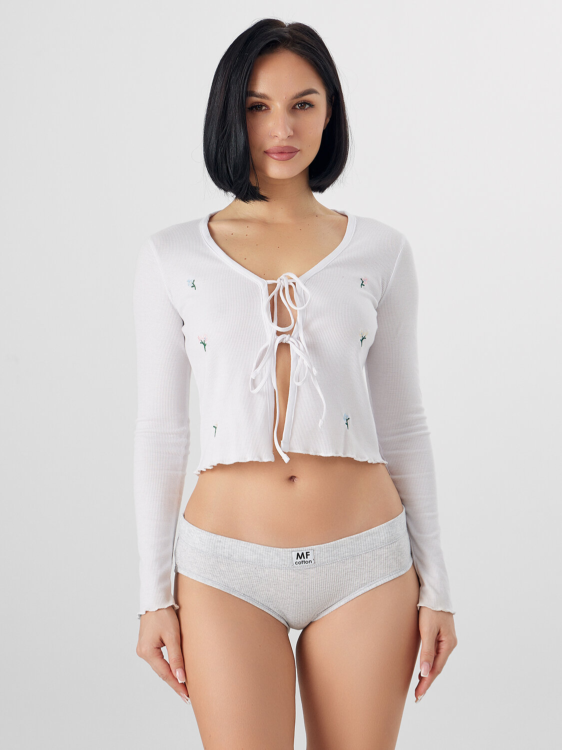 Передняя и задняя части выполнены из эластичного трикотажа, а все края аккуратно отделаны полосками из того же материала для прочности и аккуратного вида. Подкладка ластовицы из хлопка добавляет гигиеничности и мягкости.