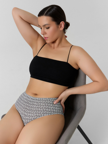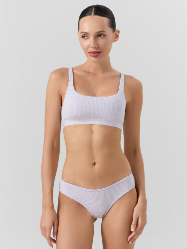 Трусы женские, средняя линия талии, силуэт - бразилиано. Передняя и задняя детали выполнены из рибаны. Верхний срез трусов обработан бейкой поперечной из рибаны, внутри жилка 6мм. Нижние срезы обработаны бейками поперечными из рибаны. Подкладка ластовицы из хлопка, отлетная по верхнему срезу. Посередине бейки по верхнему срезу передней и задней детали застрочена «птичка». серый меланж