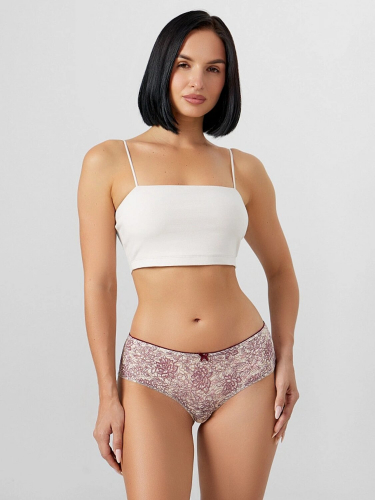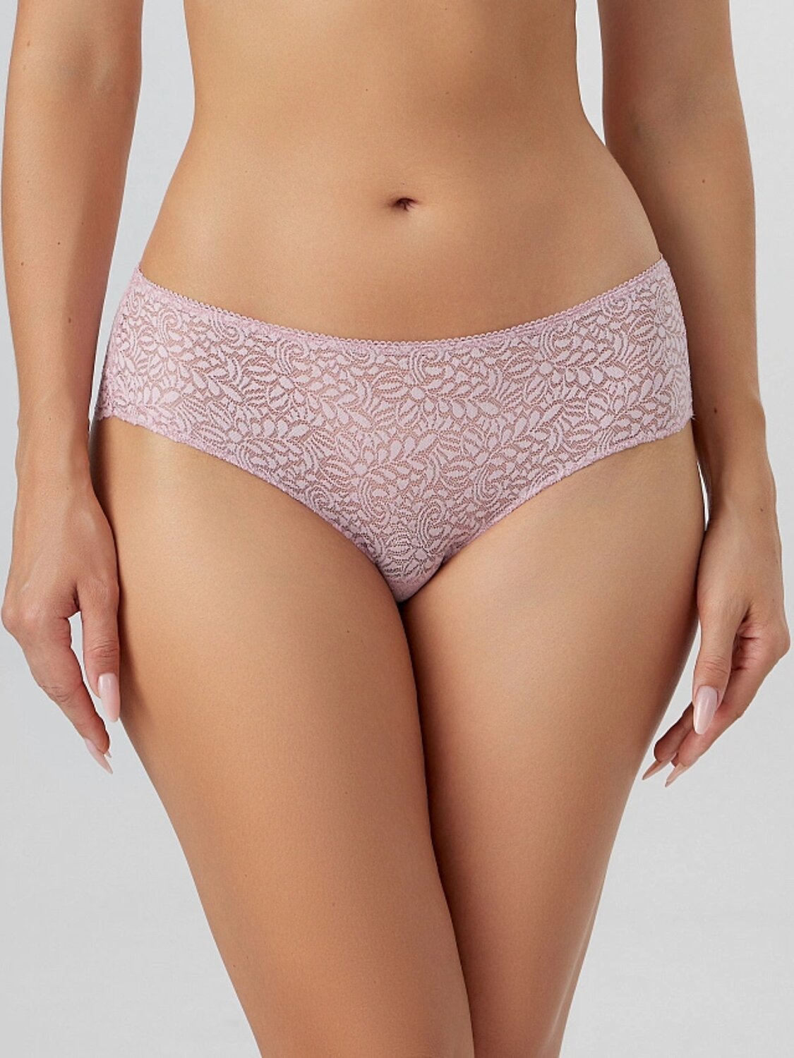 Трусы женские, средняя линия талии, шорты. Передняя деталь выполнена из кружевного полотна. Задние детали выполнены из кружева. Подкладка ластовицы из хлопка, отлетная по верхнему срезу. Верхний срез обработан тесьмой с зубом. Нижние срезы передней детали обработаны жилкой. лиловый