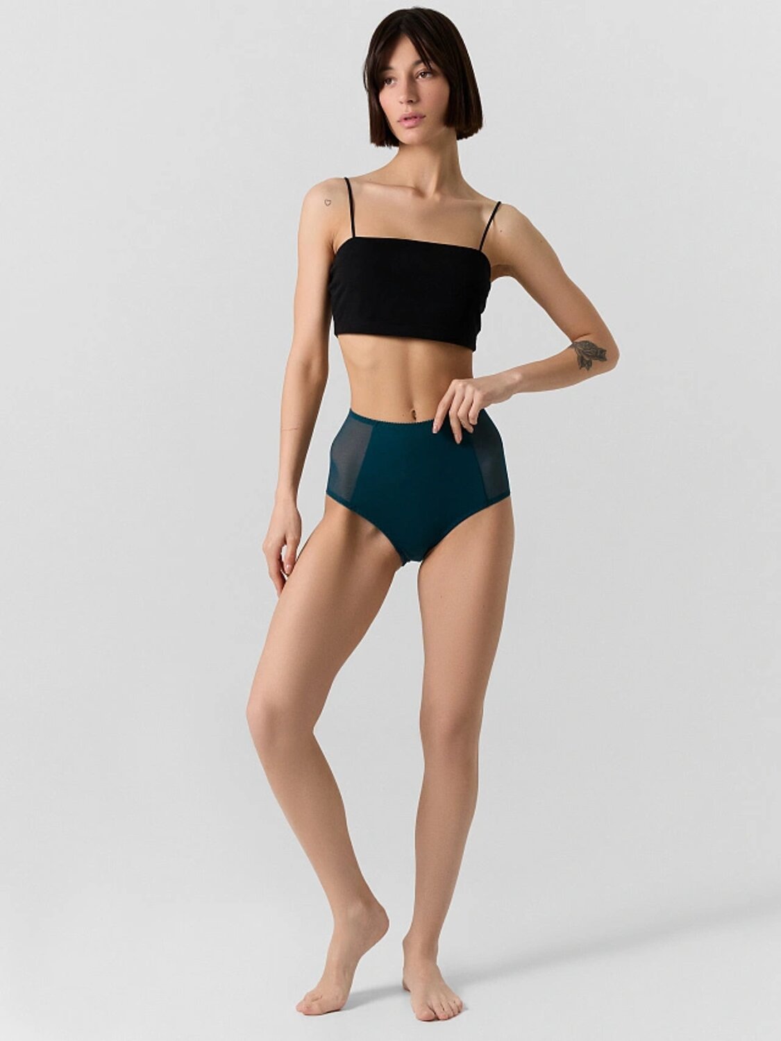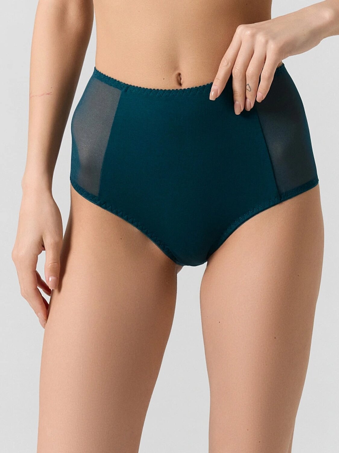 Трусы женские макси с высокой посадкой из кулирной глади. Передняя деталь из хлопка, с отрезными бочками, переходящими на заднюю деталь. Бочки выполнены из эластичной сетки. Задняя деталь из хлопка. Подкладка ластовицы из хлопка, отлетная по переднему краю. Талия обработана жесткой эластичной тесьмой с зубом в один прием. Ножки обработаны эластичной тесьмой. атлантическая глубина