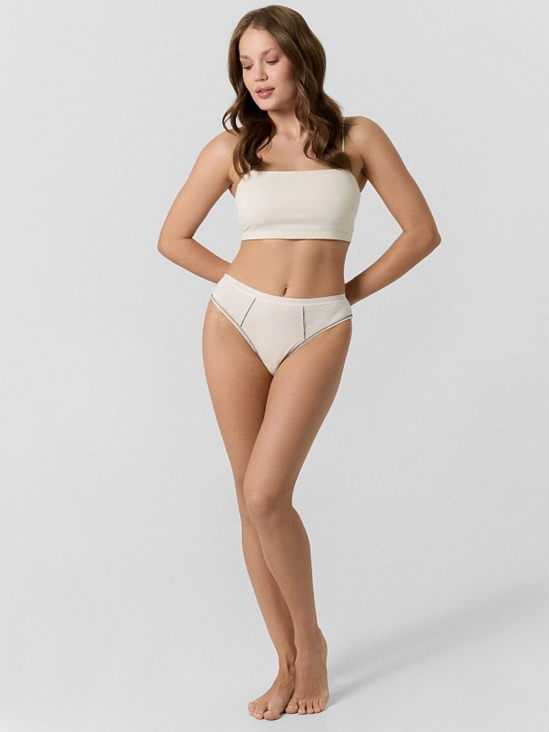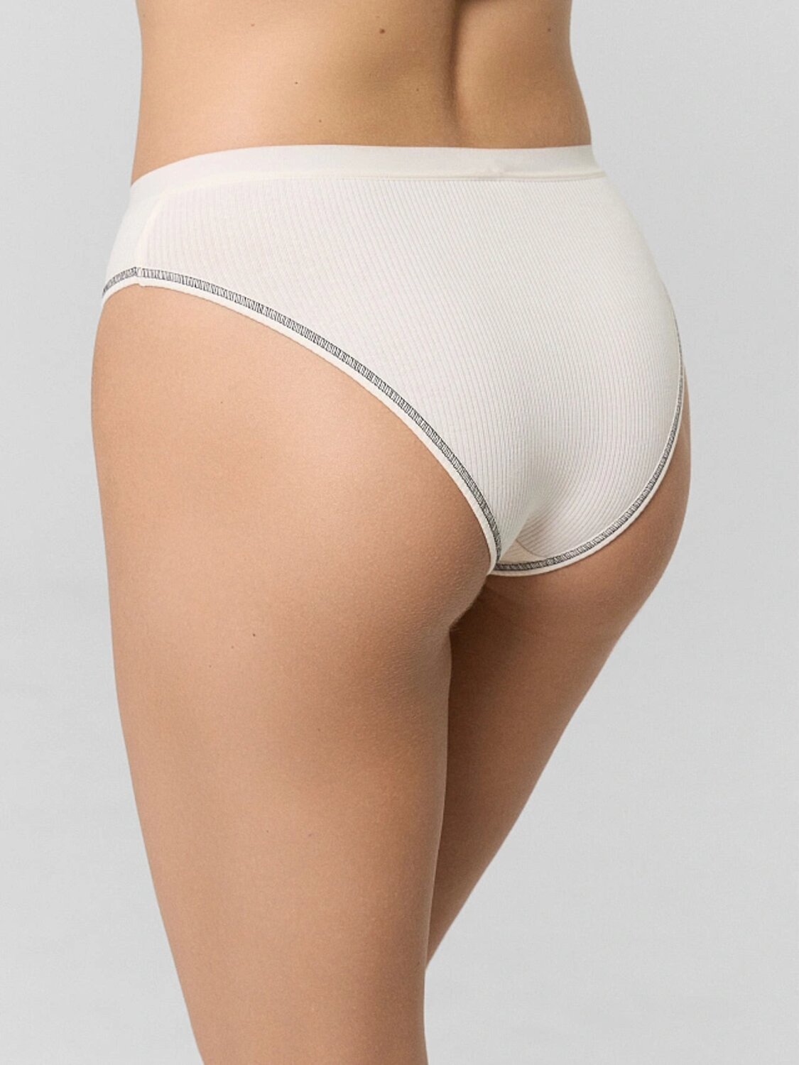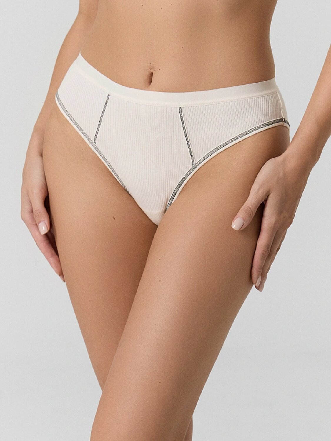 Трусы женские со средней линией талии силуэта «слип» из трикотажного полотна рибана. Передняя деталь с рельефами, по которым проложены декоративные строчки. Ластовица из кулирной глади отлетная по переднему срезу.