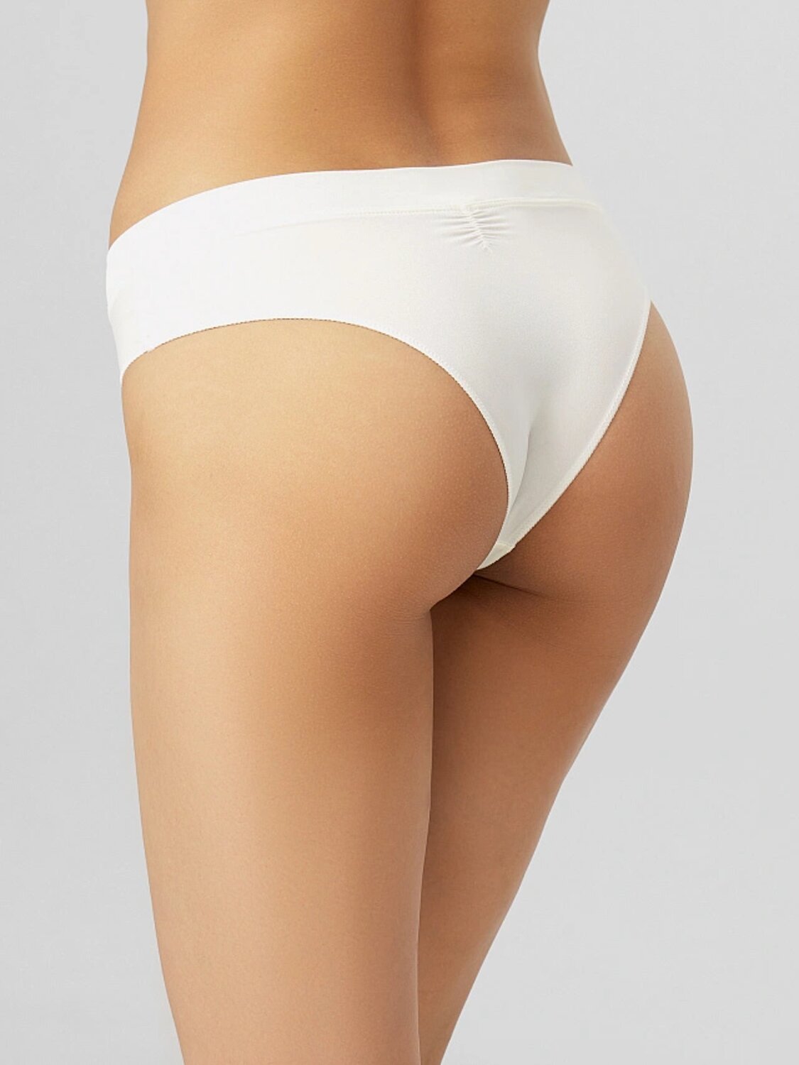 Женские трусы силуэта «бразилиана» со средней посадкой выполнены из мягкой и гладкой микрофибры, которая обеспечивает комфорт и легкость в носке. Ластовица из кулирной глади добавляет гигиеничности и приятные тактильные ощущения. Задняя деталь украшена сборкой по центру в верхней части, что придает модели изящный акцент и подчеркивает форму. Нижние срезы обработаны эластичной тесьмой, благодаря чему изделие надежно фиксируется, не создавая дискомфорта и оставаясь незаметным под одеждой. Такой вариант идеально подойдет для тех, кто ценит сочетание удобства и утонченного дизайна. шампань