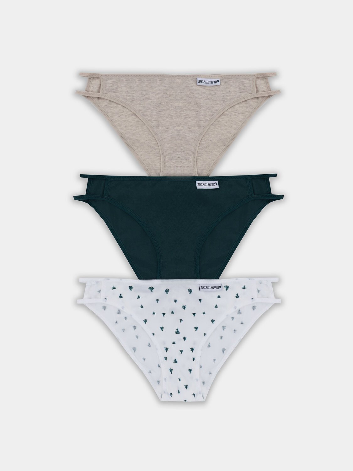 Набор из трех женских слипов с новогодним принтом создан для тех, кто ценит ежедневный комфорт и праздничное настроение. Каждая модель со средней посадкой обеспечивает удобную поддержку и идеальную посадку, которая сохраняется в течение всего дня. Протяжки по боковым швам аккуратно подчеркивают силуэт.