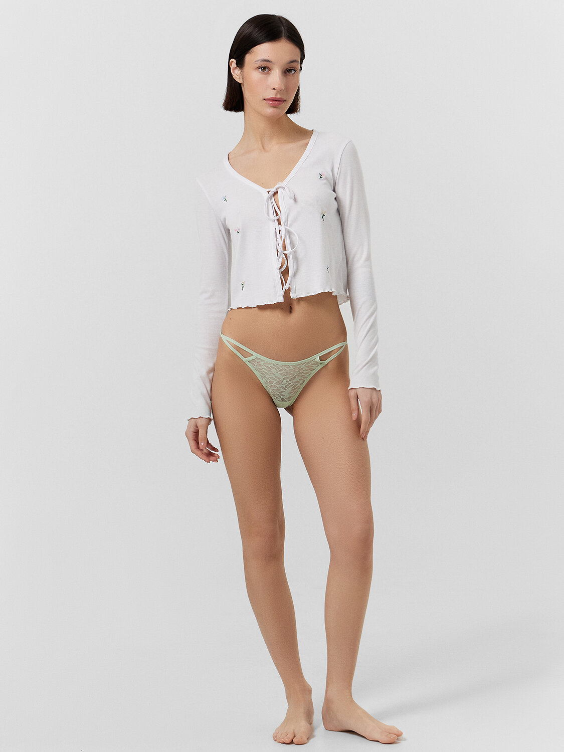 Очаровательные кружевные трусики бразилиано — это сочетание утонченности и комфорта, которое подчеркнет вашу красоту! Модель со средней посадкой обеспечивает идеальную посадку и комфортное прилегание, адаптируясь к форме тела. Выполненные из эластичного кружевного материала, трусики дарят коже нежное прикосновение, одновременно создавая стильный и изысканный образ. Ластовица из кулирной глади добавляет изделию дополнительное удобство, обеспечивая мягкость и воздухопроницаемость в течение дня. Особенным акцентом являются декоративные колечки по бокам, которые придают модели уникальность и изящный шарм. Эти трусики станут великолепным выбором для тех, кто хочет внести нотку утонченности в свой гардероб, не забывая о комфорте. Рекомендуем! мятный