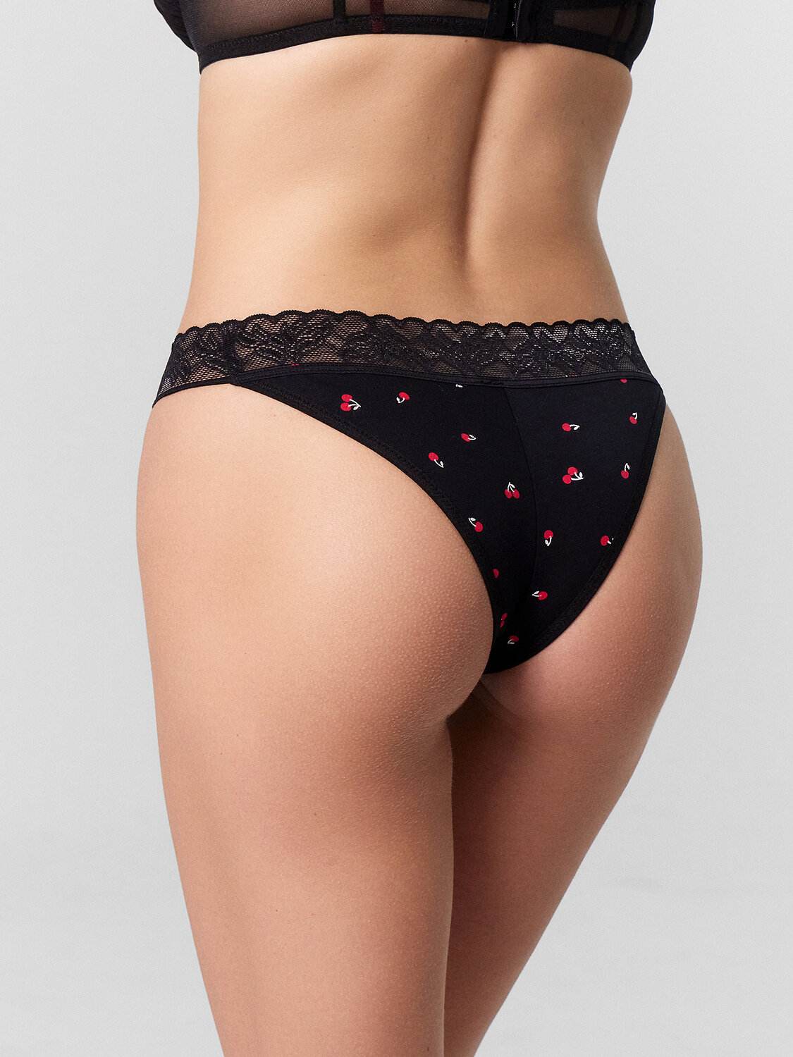 Трусы женские, силуэт бразилиана, из кулирного полотна, со средней посадкой. Передняя деталь из кулирного полотна цельная, с V-образной линией талии. Задняя деталь трусов со швом. Подкладка ластовицы из кулирного полотна, отлетная по переднему срезу.