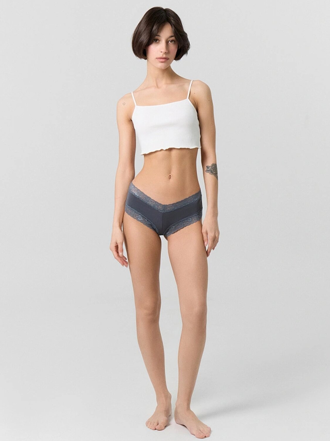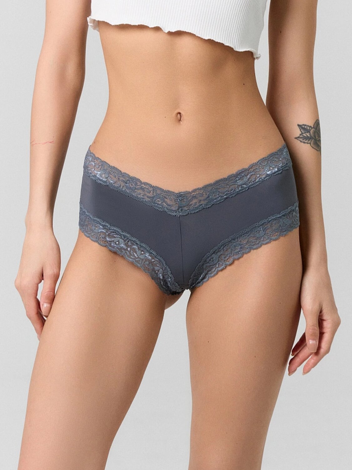 Женские трусы-бразилиана с кружевными вставками — это стильный и элегантный выбор для тех, кто ценит утонченность и комфорт.Модель из микрофибры отличается мягкостью и идеальной посадкой, обеспечивая удобство и легкость в носке. Средняя посадка и V-образная линия талии подчеркивают изящные линии фигуры, добавляя женственности образу. Кружевные вставки придают модели романтичный и утонченный вид, а передняя и задняя детали со средним швом гарантируют аккуратную и комфортную посадку. Ластовица с подкладкой из кулирного полотна обеспечивает дополнительное удобство и гигиеничность. Эта модель станет отличным дополнением вашего гардероба, сочетая практичность и изысканность. Прекрасный выбор для создания красивого и уверенного образа! графит